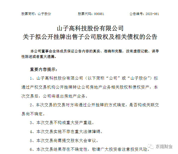 10月30日,山子股份第八届董事会第十八次临时会议审议通过了《关于拟公开挂牌出售子公司股权及相关债权的议案》,同意公司公开挂牌转让房地产业务相关股权和债权。公司独立董事已发表了同意的书面意见。