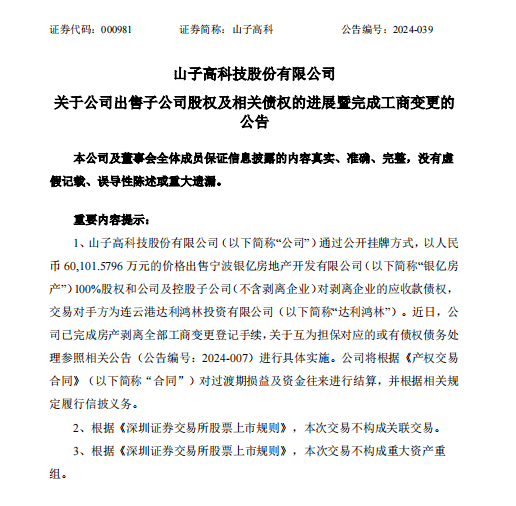 交易对手方为连云港达利鸿林投资有限公司(以下简称“达利鸿林”)。现已完成剥离业务的全部工商变更登记手续。至此,山子高科正式告别深耕30年的房地产行业。