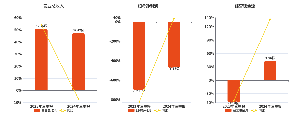 公司营业总收入为39.42亿元,在已披露的同业公司中排名第51,较去年同报告期营业总收入减少3.03亿元,同比较去年同期下降7.13%。归母净利润为-8.17亿元,在已披露的同业公司中排名第239,较去年同报告期归母净利润增加3.98亿元。经营活动现金净流入为3.34亿元,在已披露的同业公司中排名第56,较去年同报告期经营活动现金净流入增加12.52亿元。