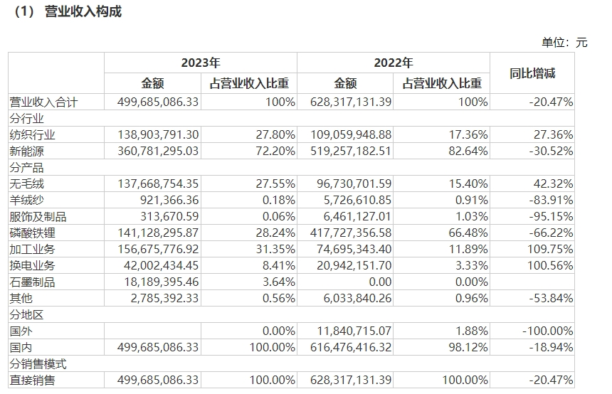 正如中银绒业的证券简称所示,这是一家以羊绒纺织业务起家的企业,但如今,其新能源业务贡献的营收已经远超纺织业务。去年,中银绒业纺织业务实现营收1.39亿元,新能源业务实现营收3.61亿元,后者占总营收比重超70%。