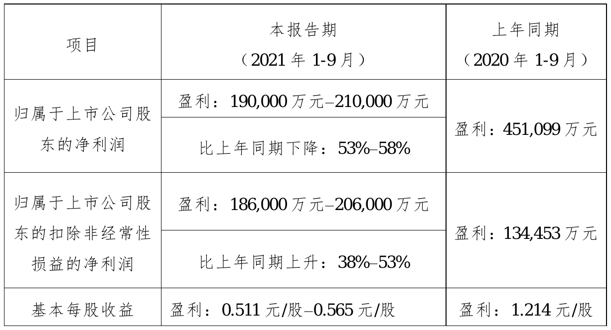 越秀金控(000987)近日发布2021年前三季度业绩预告公告,预计2021年前三季度实现归属于上市公司股东的净利润为190000万元–210000万元,比上年同期减少53%–58%。