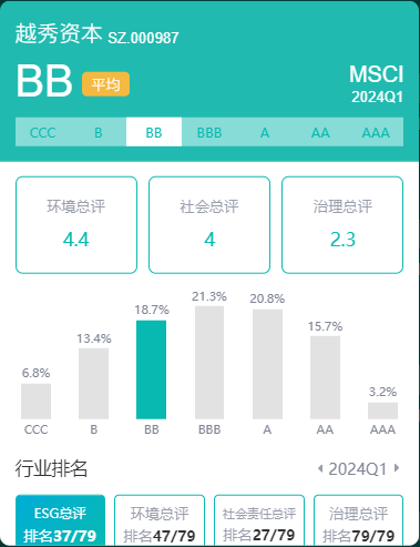 近日,MSCI发布了2024年第一季度ESG评级。越秀资本评级为BB,行业排名平均。