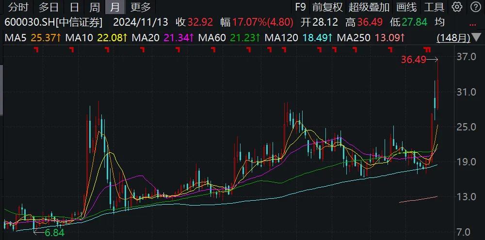 截至2024年10月30日,越秀资本信证券13.25亿股股份,占中信证券总股本的 8.94%,其中包括中信证券A股9.31亿股、中信证券H股3.94亿股。也正是在此时,越秀资本停止了增持的步伐,开启了减持的模式。