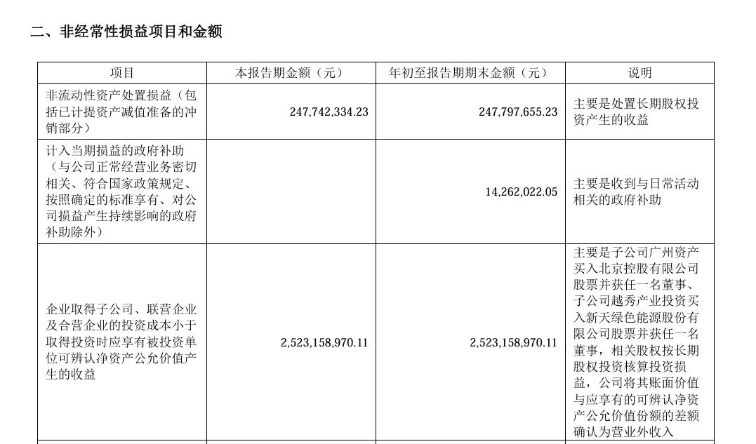 这说明,公司利润增长并非源于核心经营业务的扎实推进,而是依赖非经常性损益的“一次性助力”,所谓的业绩增长更像是一场缺乏基本面支撑的账面繁荣。支撑这份账面繁荣的收益来源主要有两处。其一为约2.5亿元的“非流动资产处置损益”,这笔收益或许源于公司对中信证券(600030)的减持,早在2024年11月,越秀资本就已公告拟通过二级市场出售不超过中信证券总股本1%的股份;另一项高达25.2亿元的收益,则来自长期股权投资的权益法核算,公司子公司对北京控股(00392)、新天绿能(600956)的长期股权投资,因投资成本低于被投资方可辨认净资产公允价值份额,按照会计处理规则确认的账面收益。