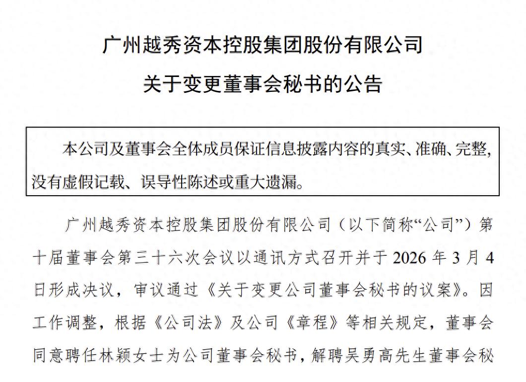 3月5日,广州越秀资本控股集团股份有限公司(简称越秀资本,000987.SZ)发布公告显示,因工作调整,越秀资本董事会同意聘任林颖为公司董事会秘书,吴勇高不再担任该职务。此次越秀资本调换董秘改变了吴勇高“总经理兼董秘”这一在上市公司中并不常见的过渡性架构,新任董秘林颖身兼越秀资本财务总监,则较为符合行业主流。