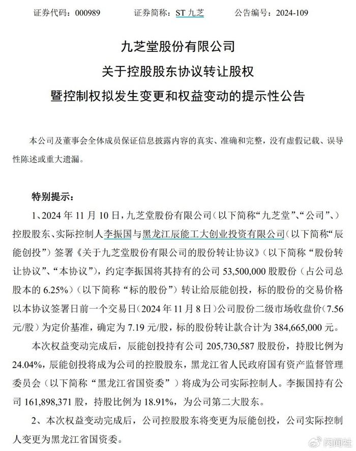 11月11日晚,ST九芝(000989.SZ)发布公告,宣布公司控股股东、实际控制人李振国与黑龙江辰能工大创业投资有限公司(以下简称“辰能创投”)签署股份转让协议,将其持有的公司6.25%股份转让给辰能创投。此次股权转让完成后,辰能创投将成为ST九芝的控股股东,黑龙江省国资委将成为公司的实际控制人。