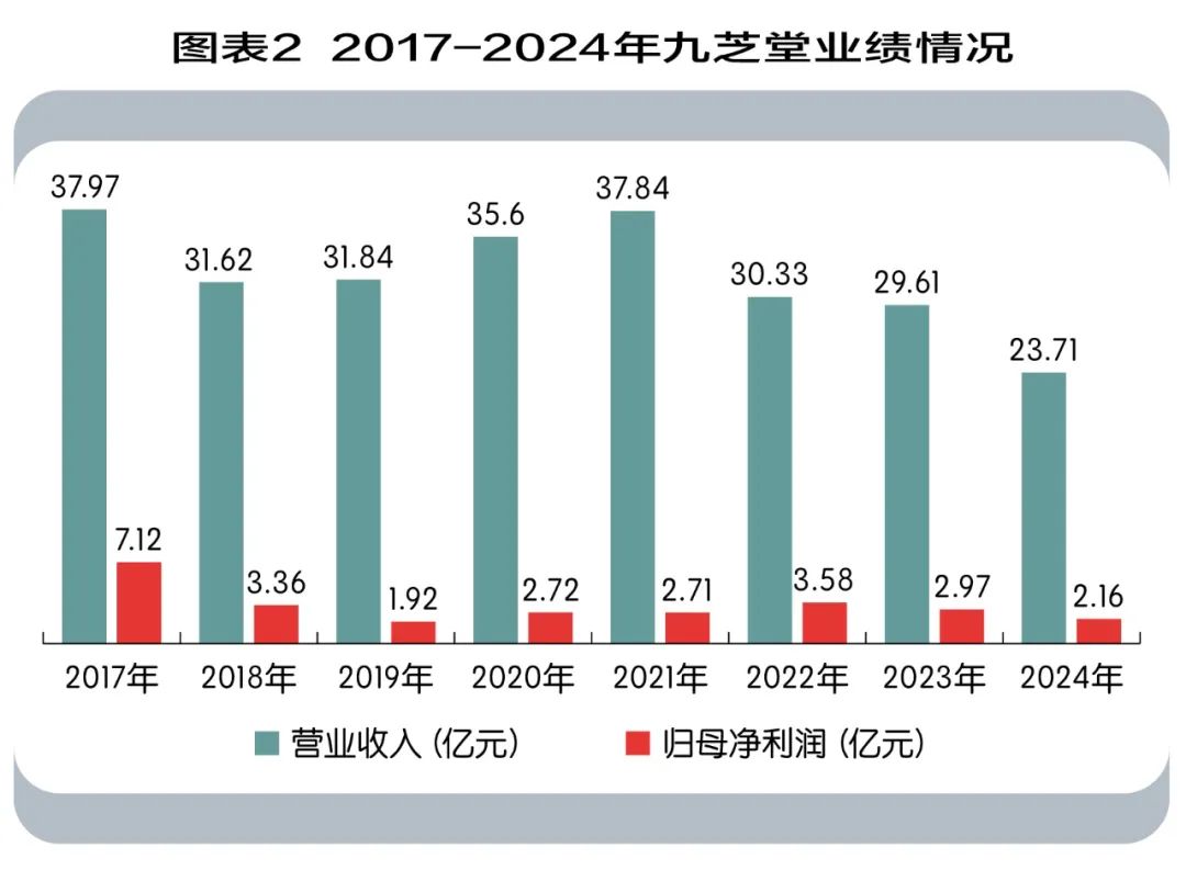 相比之下,同仁堂同期营业收入从2017年的133.76亿元增长至2024年的185.97亿元,归母净利润从10.17亿元提升至15.26亿元。这组业绩数据对比背后,藏着九芝堂的“失速密码”。