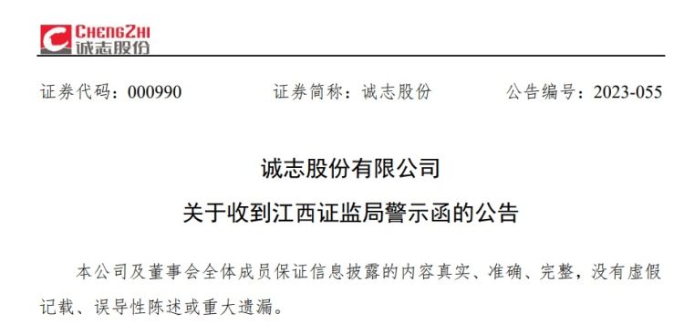 10月10日晚间,诚志股份(000990)公告,公司于2023年10月9日收到中国证券监督管理委员会江西监管局出具的《关于对诚志股份有限公司、龙大伟采取出具警示函措施的决定》。