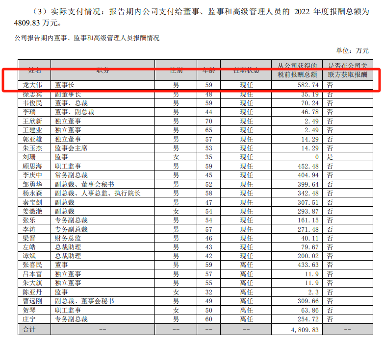 从薪酬来看,诚志股份董事长龙大伟2022年薪酬为582.74万元,2023年薪酬为382.31万元,同比下滑约34.4%。