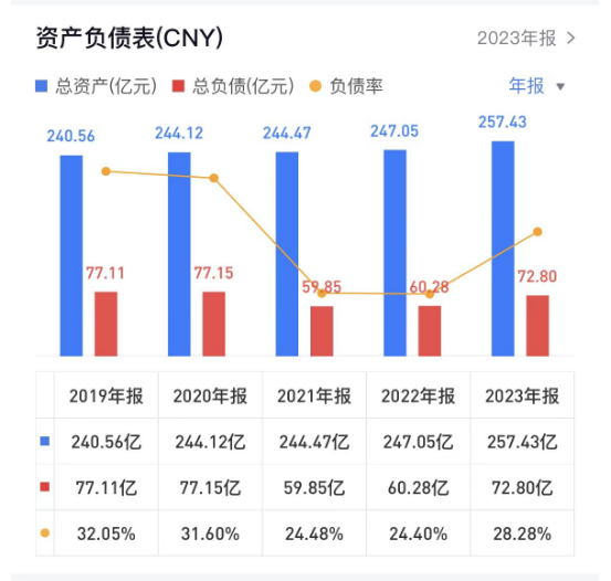截至2023年末,诚志股份商誉67.42亿元,占总资产比例为26.19%。此外,截至2023年末,诚志股份总负债为72.8亿元。
