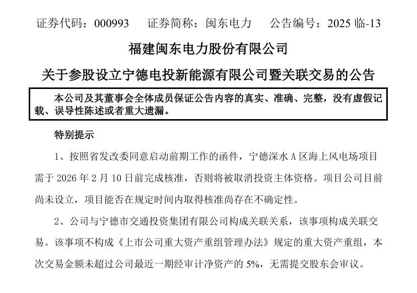 公告披露,闽东电力第九届董事会第一次临时会议审议通过了《关于参股设立宁德电投新能源有限公司的议案》,同意公司以自有资金出资8000万元,持股10%与国家电投集团福建电力有限公司(以下简称“国电投福建公司”)及宁德市交通投资集团有限公司(以下简称“市交投集团”)合资设立宁德电投新能源有限公司(暂定名,以下简称“宁德电投公司”),由该公司负责宁德深水B-1区海上风电场项目的开发建设及运营管理工作,公司根据项目进展情况按股比分阶段进行注资。