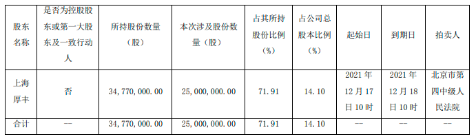 11月17日,皇台酒业(SZ000995)公告,持股5%以上股东上海厚丰投资有限公司(以下简称“上海厚丰”)所持有的部分皇台酒业股票将被拍卖。