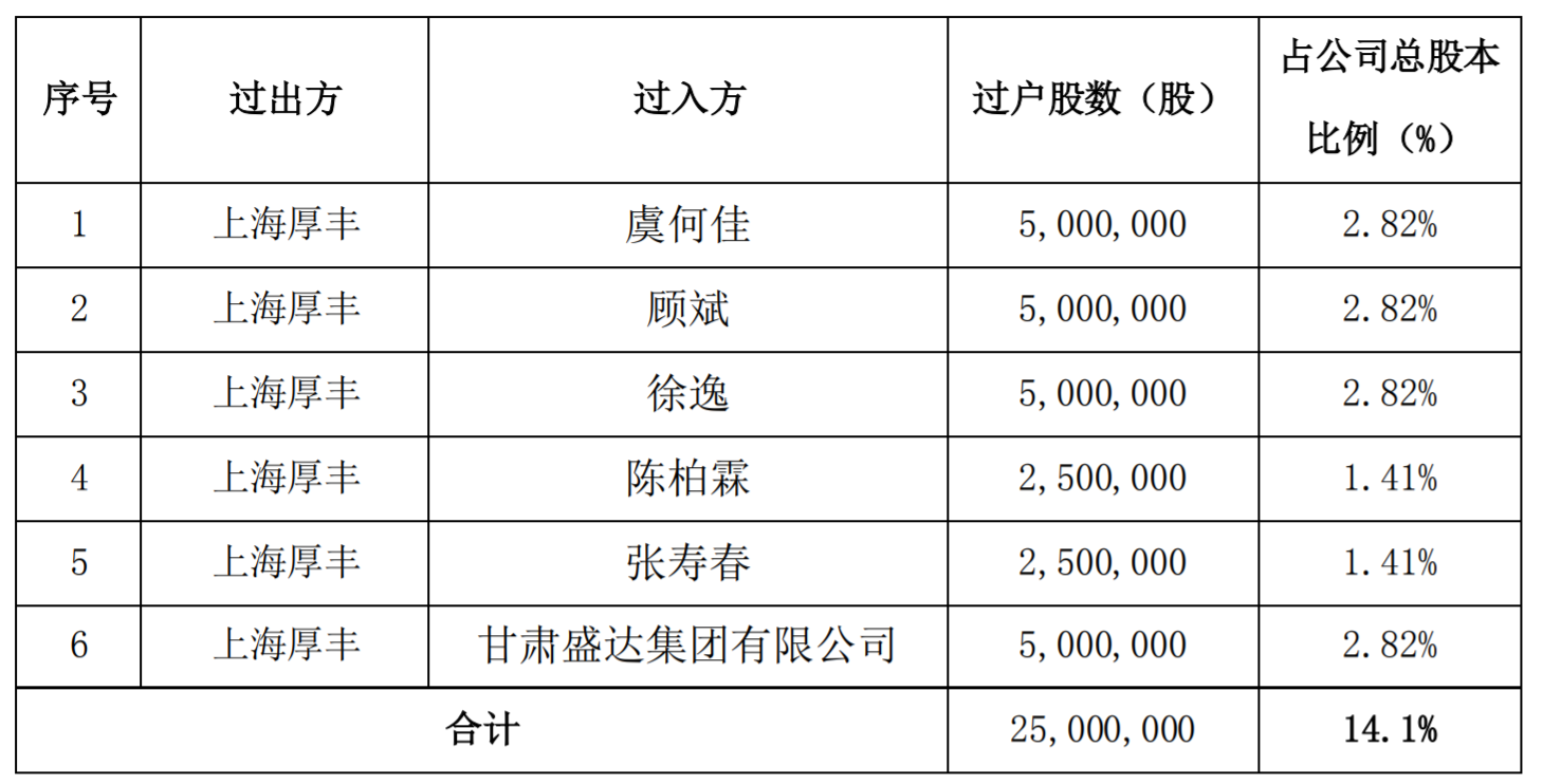 公告显示,皇台酒业于2022年1月4日通过中国证券登记结算有限责任公司深圳分公司结算系统查询,上海厚丰投资有限公司持有的皇台酒业无限售流通A股2500万股股份已完成司法拍卖过户登记手续,占皇台酒业总股本比例为14.1%。