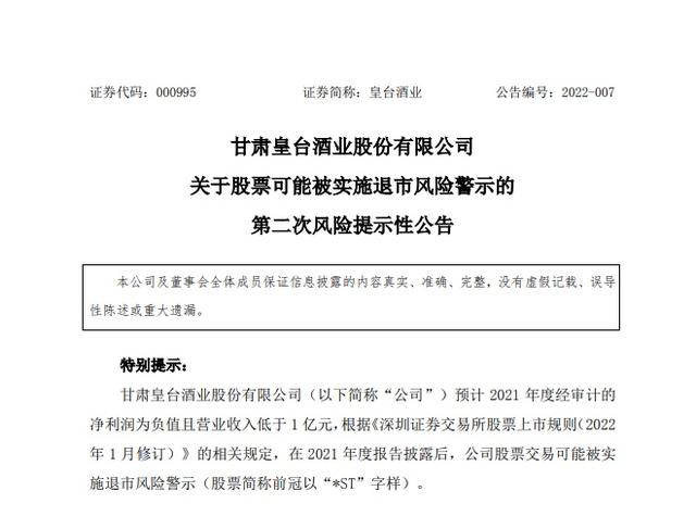 3月4日,甘肃皇台酒业股份有限公司(以下简称“皇台酒业”)发布公告称,皇台酒业预计2021年度经审计的净利润为负值,且营业收入低于1亿元,根据《深圳证券交易所股票上市规则(2022年1月修订)》的相关规定,在2021年度报告披露后,公司股票交易可能被实施退市风险警示(股票简称前冠以“*ST”字样)。