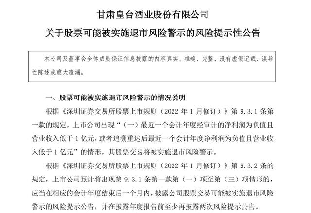1月27日,甘肃皇台酒业股份有限公司董事会发布《关于股票可能被实施退市风险警示的风险提示性公告》,做出退市风险警示: