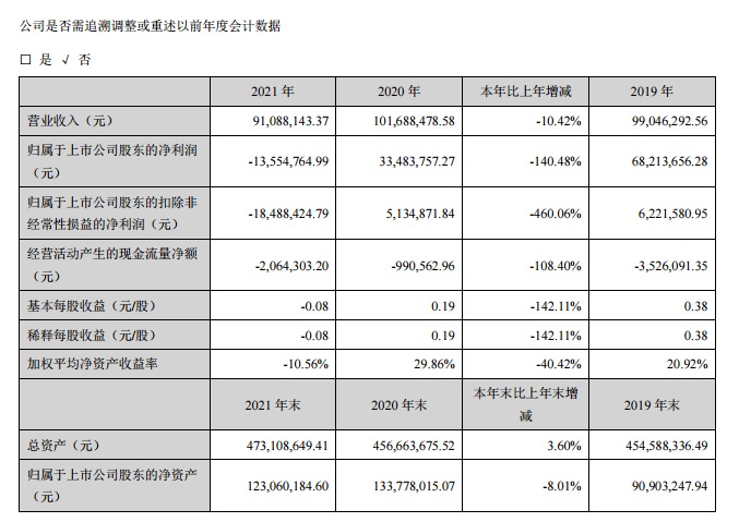 4月27日,皇台酒业发布2021年报显示,2021年实现营业收入0.91亿元,同比下降10.42%;归属于上市公司股东的净利润亏损0.14亿元,同比下降140.48%;经营活动产生的现金流净额亏损206.43万元,同比下降108.4%。