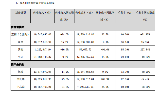 2021年皇台酒业全线产品毛利率均下降。根据公告显示,皇台酒业高端、中高端、中低端、低端产品分别实现营业收入0.18亿元、0.19亿元、0.4亿元、0.13亿元,同比提升-60.8%、-21.5%、173%、-17.7%;毛利率分别为70.23%、60.2%、67.55%、13.7%,同比增长-3.01%、-22.2%、-5.41%、-60.7%。除此,从销售模式划分,去年皇台酒业直销(含团购)、经销渠道分别实现营业收入0.5亿元、0.4亿元,同比提升-24%、15.1%;毛利率分别为60.5%、56.14%,同比增长-21.95%、15.95%。