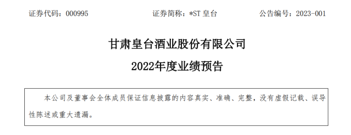 也就是说,在2022年,如果皇台酒业的业绩数据不达标,公司将被终止上市。但皇台酒业很争气,在2023年1月30日对外披露的2022年度业绩预告中称,实现营业收入为1.35亿元-1.55亿元。