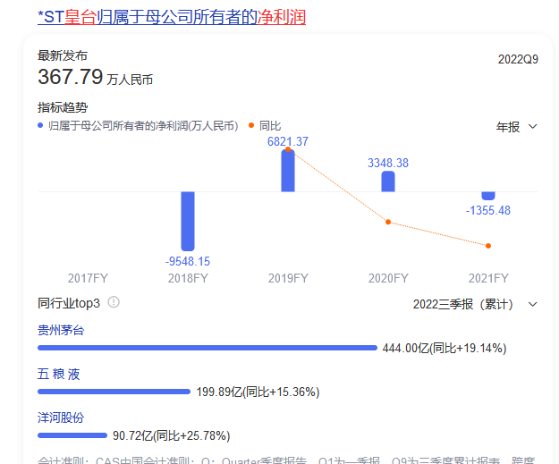 2000年,*ST皇台先于茅台一年上市。没想到前路坎坷,因业绩盈盈亏亏,多次带帽多次保壳。