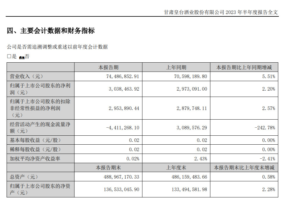 另据皇台酒业半年报显示,2023年上半年,公司实现营收7448.69万元,同比增长5.51%;归属于上市公司股东的净利润303.85万元,同比增长2.2%。