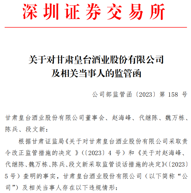 风口财经注意到,针对上述关联交易事件,8月25日,皇台酒业曾发布关于公司及相关人员收到中国证监会甘肃监管局下发的行政监管措施决定书的公告。