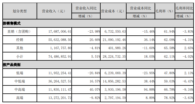 白酒半成品为低端酒和中低端酒的基酒,从数据看,公司的低价产品有所增长,但是高端、中高端产品毛利率均在下滑。