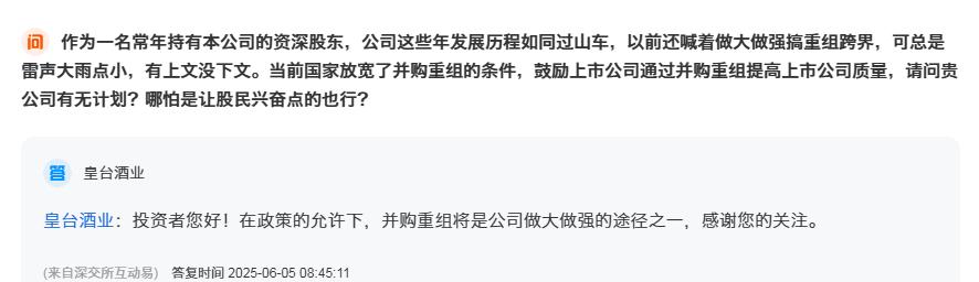 从皇台酒业的回复来看,并不完全排斥通过并购重组的方式让公司发展更进一步,但并没有透露更多消息。