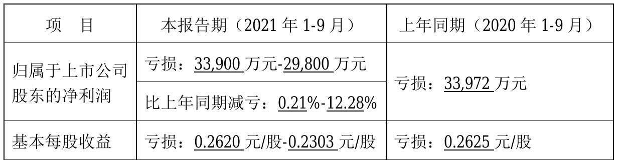 挖贝网10月14日,隆平高科(000998)近日发布2021年前三季度业绩预告公告,预计2021年前三季度实现归属于上市公司股东的净利润为亏损33900万元–29800万元,比上年同期亏损减少0.21%–12.28%。