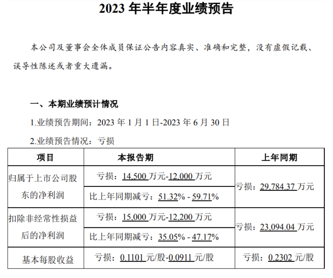 2023年该公司有继续亏损的趋势,不过亏损面有望收窄。据半年报预告,该公司预计净利润为-1.45亿元至-1.2亿元,同比减亏51.32%至59.71%。