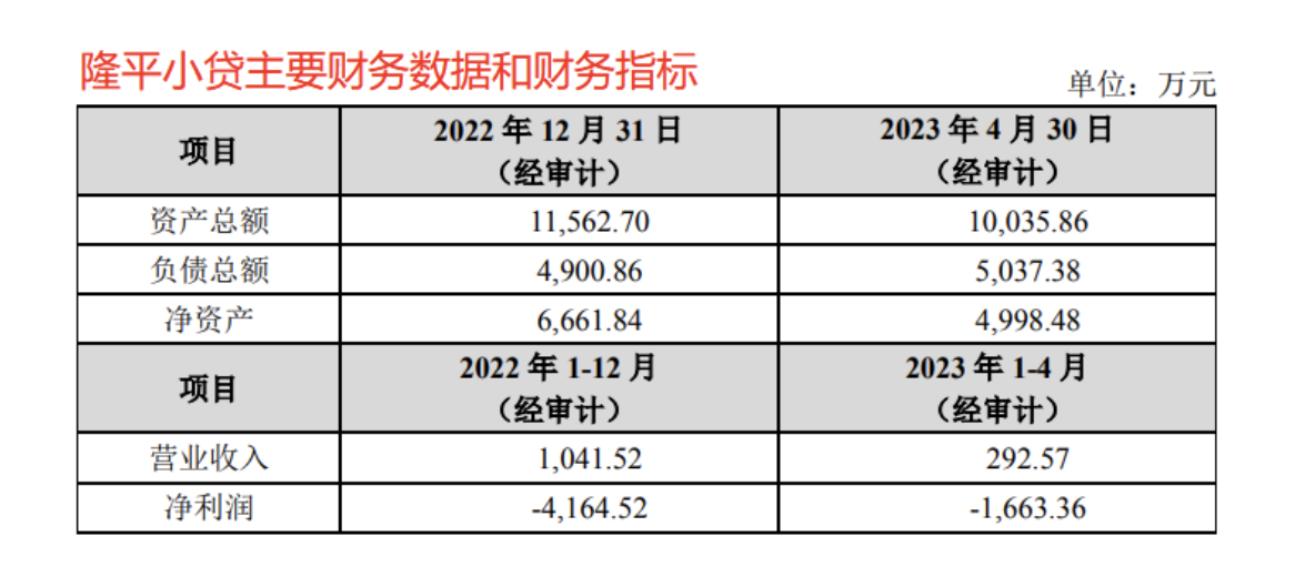 2022年和2023年1月至4月,该公司净资产分别为6661.84万元和4998.48万元,净利润分别为-4164.52万元和-1663.36万元。由此可见,隆平小贷资产缩水、连续亏损。