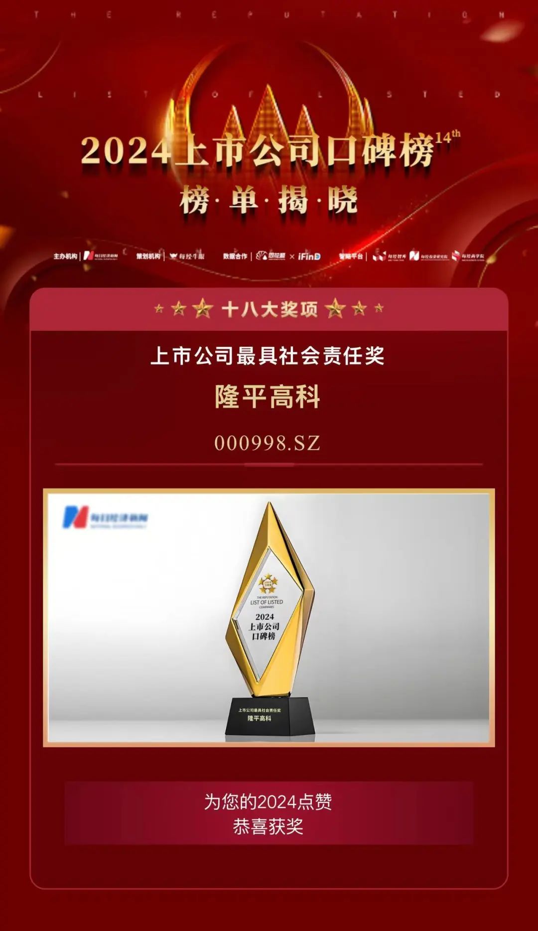 12月5日-6日,由中国上市公司协会等单位指导,每日经济新闻主办的2024第十三届中国上市公司高峰论坛在成都举行,400多家上市公司齐聚蓉城,共襄“壮大耐心资本·赋能新质生产力发展”主题盛宴。6日晚,第十四届中国上市公司口碑榜揭晓,凭借在贯彻落实粮食安全战略、传播先进农业技术等方面的实践成果,隆平高科荣获上市公司最具社会责任奖。