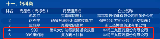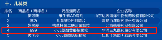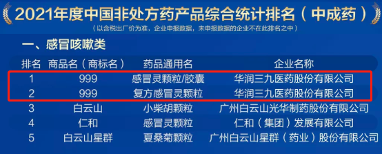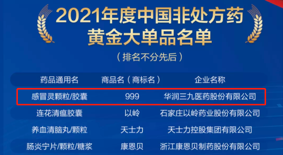 华润三九再次蝉联中国非处方药生产企业榜首,999感冒灵颗粒/胶囊连续十年荣获感冒咳嗽类(中成药)第一名,并入选”2021年度中国非处方药黄金大单品名单”,华润三九另有多个产品位居排行榜前列。