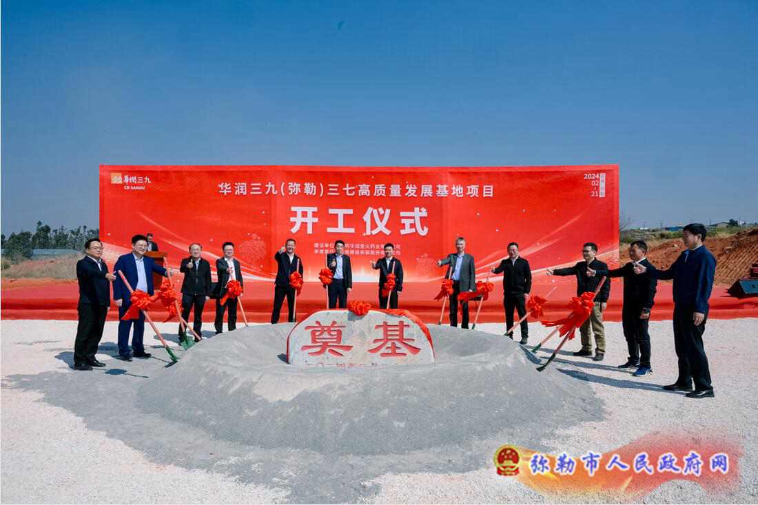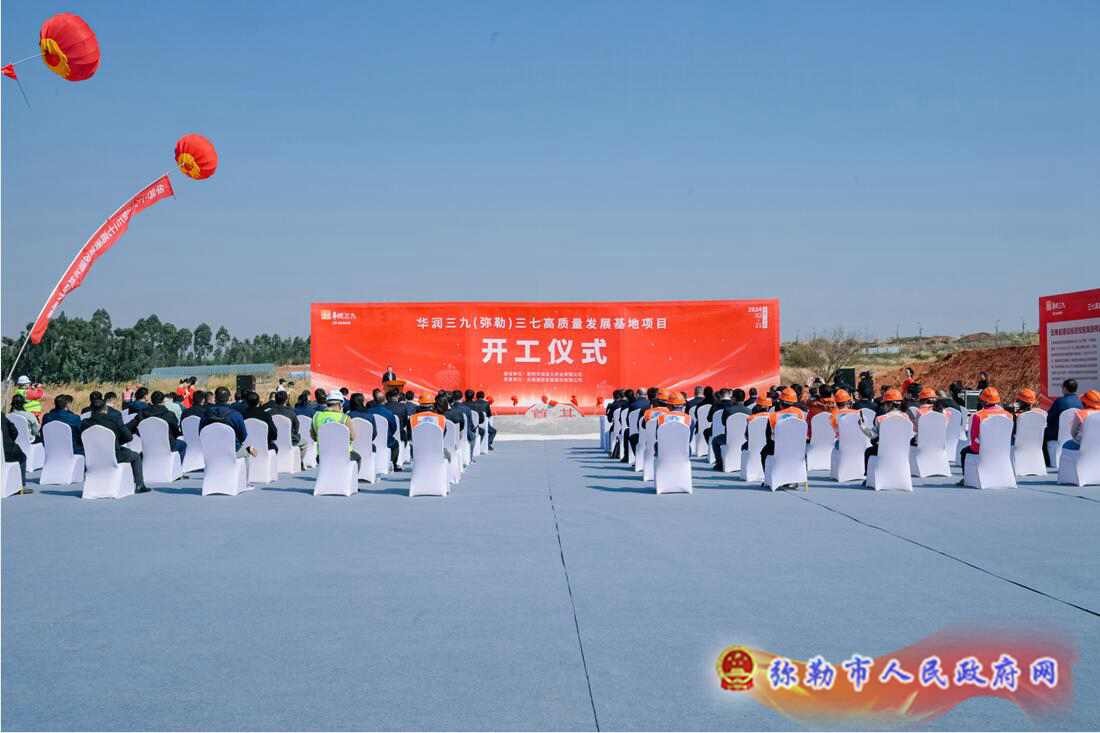 2024年2月21日,华润三九(弥勒)三七高质量发展基地项目开工仪式在云南弥勒产业园区举行,州委常委、州委秘书长、州生物医药产业链链长晋洪江,华润三九医药股份有限公司董事长邱华伟出席并致辞。州科技局局长刘杰,弥勒市委书记李健,市委副书记、市长潘金军,市人大常委会主任马金荣,市政协主席张茹权出席。云南弥勒产业园区党工委副书记、管委会副主任文武作项目建设保障服务发言。黄剑、唐举顺、王黎,市级有关部门和街道,昆药集团、华润圣火等有关企业负责人及施工方代表等参加。