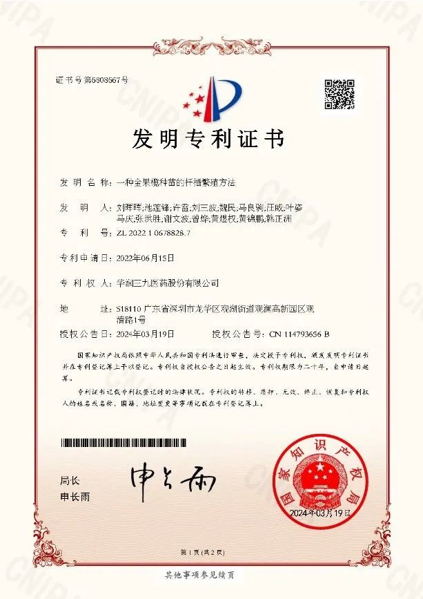 近日,华润三九申报的“一种金果榄种苗的扦插繁殖方法(专利号:ZL 2022 1 0678828.7)”获得发明专利授权。此项发明专利是对华润三九金果榄种苗繁育技术创新的认可,该项专利成功解决了现有繁殖技术周期长、取材受限、繁殖系数低、生产用具需特制等关键技术难题,创造性的提供了一种利于推广应用的扦插繁殖方法,为公司中药资源掌控提供技术支撑。