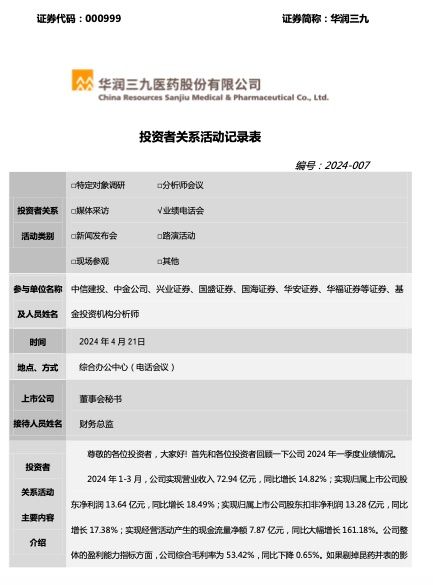 华润三九向投资者介绍了公司2024年一季度业绩情况。2024年1-3月,公司实现营业收入72.94亿元,同比增长14.82%;实现归属上市公司股东净利润13.64亿元,同比增长18.49%;实现归属上市公司股东扣非净利润13.28亿元,同比增长17.38%;实现经营活动产生的现金流量净额7.87亿元,同比大幅增长161.18%。公司整体的盈利能力指标方面,公司综合毛利率为53.42%,同比下降0.65%。如果剔掉昆药并表的影响,公司毛利率稳中有升。公司总体费用率控制较好,一季度销售费用率为21.41%,同比下降了0.69个百分点,管理费用率基本持平。经营业绩在去年较高基数的基础上,取得较好增长。