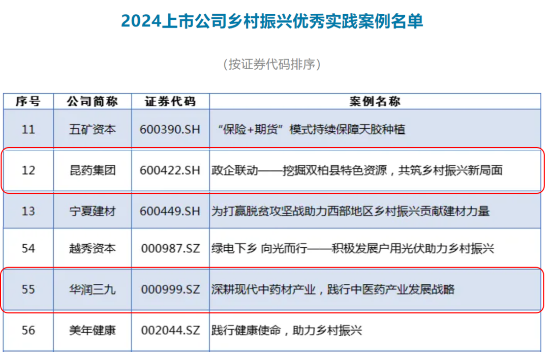 近日,中国上市公司协会揭晓了“2024上市公司乡村振兴最佳实践案例”评选结果。华润三九及旗下昆药集团凭借在乡村振兴领域的布局与成效,再度入选“上市公司乡村振兴优秀实践案例”。