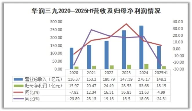近五年来,尽管集采压顶、疫情反复、行业政策多变,华润三九凭借王炸产品“999感冒灵”、“三九胃泰”等产品,这类品牌OTC用药渠道稳固、现款现货,也为公司带来了极其充沛且稳定的经营性现金流。2021-2024年的营收与净利润依然保持了稳健增长。然而2025年上半年公司实现总营业收入148.10亿元,同比仅增长4.99%;实现归母净利润18.15亿元,同比减少24.31%。通过半年报已经表现出增长放缓的现象。