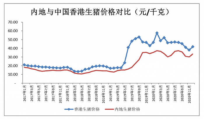 东瑞股份于2021年4月登陆深交所,其主要销售市场为中国香港和广东,是供港活大猪的前三大供应商之一。招股书显示,东瑞股份2018、2019和2020年生猪在港销售收入分别占总营收的51.61%、66.43%和66.46%。需要注意的是,香港的生猪价格始终高于内地,东瑞股份较内地猪企具有一定的价格优势。有数据统计显示,2021年12月当月,东瑞股份是各大企业中唯一一家卖猪价格在20元/公斤以上的企业,其它企业的卖猪价格普遍在14.5元―17.5元之间。
