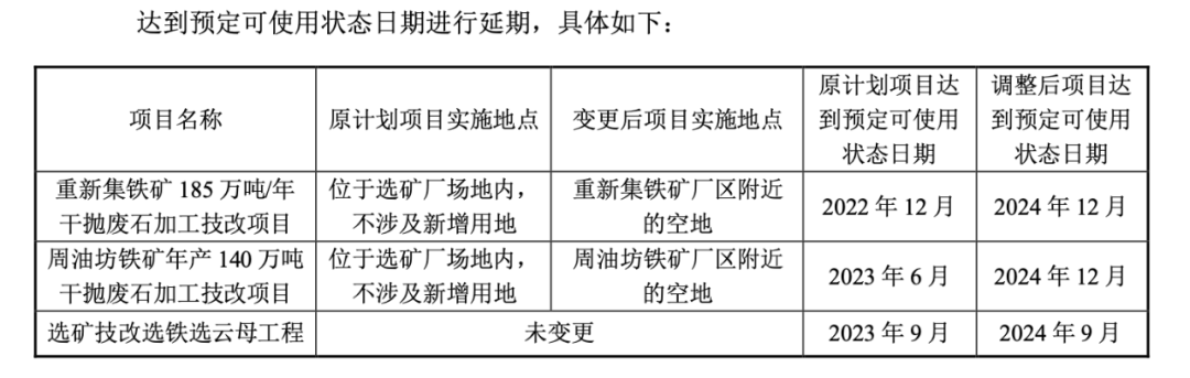 其中,“周油坊铁矿年产140万吨干抛废石加工技改项目”、“重新集铁矿185万吨/年干抛废石加工技改项目”、“选矿技改选铁选云母工程”的达到预定可使用状态的时间延期至2024 年12月、2024年12月、2024年9月,较原计划延期了1-2年。
