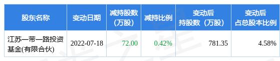 7月19日盛航股份发布公告《盛航股份:关于持股5%以上股东减持股份比例达到1%暨减持计划数量过半的进展公告》,其股东江苏一带一路投资基金(有限合伙)于2022年7月9日至2022年7月18日间合计减持72.0万股,占公司目前总股本的0.4219%,变动期间该股股价上涨3.57%,截止7月18日收盘报20.29元。