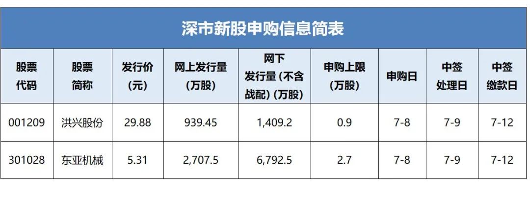 2021年7月8日,广东洪兴实业股份有限公司(简称:洪兴股份)和厦门东亚机械工业股份有限公司(简称:东亚机械)将通过深交所网下发行电子平台和交易系统发行新股,具体信息如下。