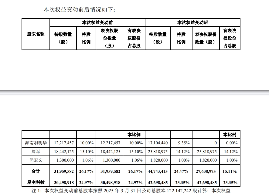与此同时,星空科技的一致行动人陈耀民与海南羽明华签署《股份转让协议》,拟受让6,119,327股公司股份,占公司股份总数的5.01%。