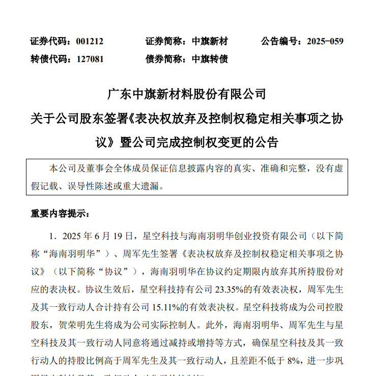 本次控制权变更的基础是前期股权转让的推进。回溯至2025年3月31日,星空科技与中旗新材控股股东海南羽明华、实际控制人周军等签署《股份转让协议》,拟协议收购转让方持有的合计30,498,918股公司股份,占公司股份总数的24.97%。