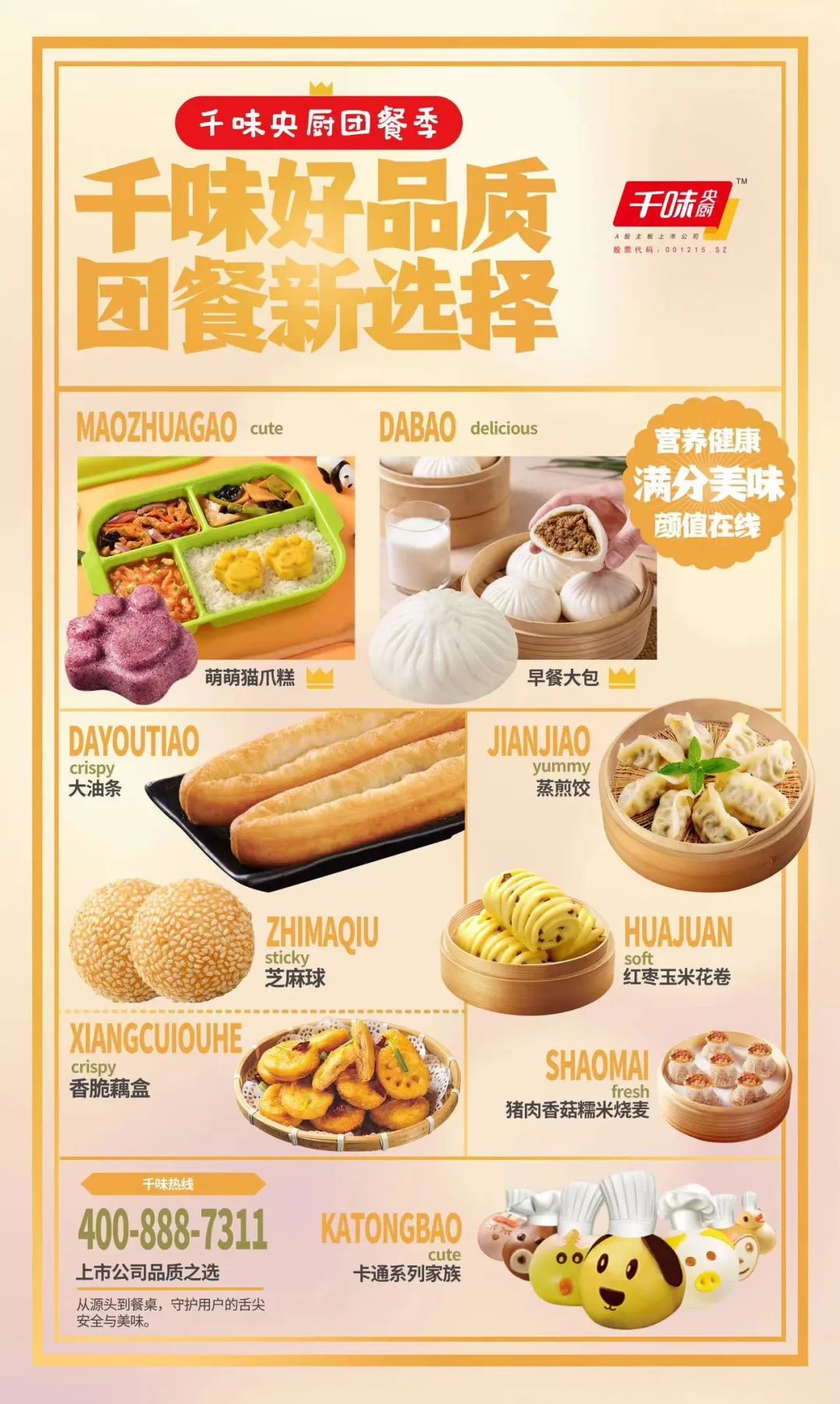 千味央厨针对团餐行业安全高效、多样化的产品需求不断创新,推出团餐系列安全美味、营养健康的放心食品:蒸煎饺、大油条、芝麻球、猪肉香菇糯米烧麦、萌萌猫爪糕、早餐大包、红枣玉米花卷、卡通家族系列、香脆藕盒等,为团餐安全、高效保驾护航。