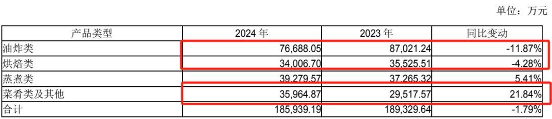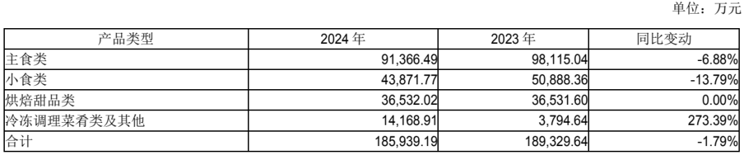 年报显示,报告期内,下游客户为积极应对市场竞争调整产品及采购策略,同时受产品生命周期影响,部分传统产品更新迭代,而新品处于上市初期,市占率尚不及传统产品。受此影响,公司油炸类核心单品主食油条、芝麻球、春卷以及烘焙类单品蛋挞皮均出现销售收入下滑情况,因该等单品在各自品类中占比较大,导致油炸类产品和烘焙类产品销售收入同比出现下滑。