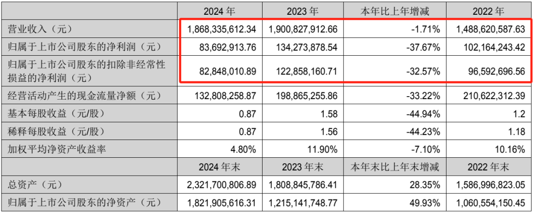 4月26日凌晨,千味央厨公布2024年年报,公司2024年营业收入为18.68亿元,同比下降1.71%;归母净利润为8369.29万元,同比下降37.67%;扣非归母净利润为8284.80万元,同比下降32.57%;基本每股收益0.87元。