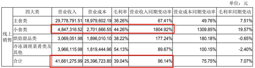年报显示,千味央厨线上销售实现营收4166.13万元,同比增加96.14%。其中,小食类产品营收增幅最大,达到1804.92%。此外,线上销售综合毛利率也同比增加7.07%。
