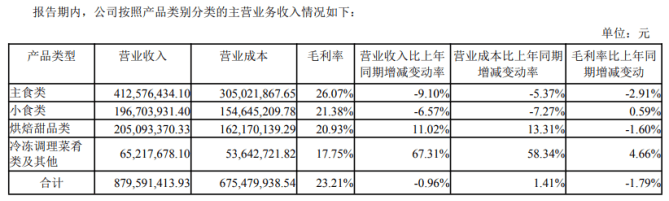 千味央厨解释称,报告期内主食类和小食类主要受市场竞争及产品生命周期影响,部分传统产品更新迭代,而新品处于上市初期,市占率尚不及传统产品,导致该品类整体销售收入下滑。