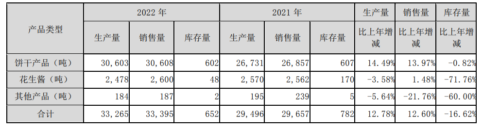 具体来看,2022年,青岛食品的饼干产品、花生酱的销售量依次为30608吨、2600吨。