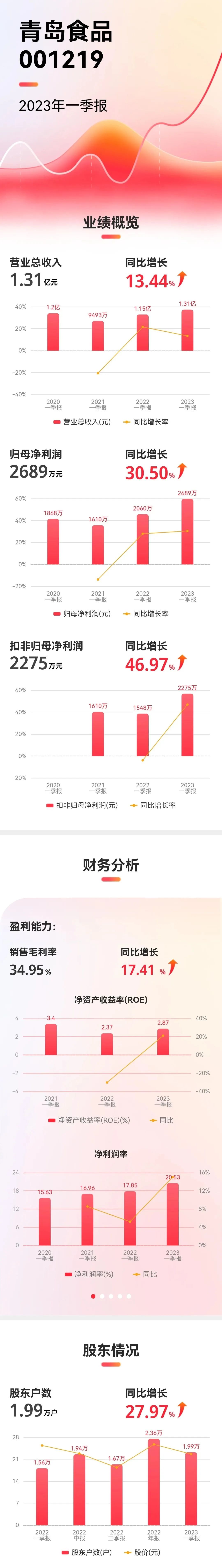 2023年4月27日,青岛食品对外发布《2023年一季度报告》。报告期内,实现营业收入13,097.96万元,同比增长13.44%;实现归属于上市公司股东的净利润2,688.82万元,同比增长30.50%;实现归属于上市公司股东的扣除非经常性损益的净利润2,274.66万元,同比增长46.97%。